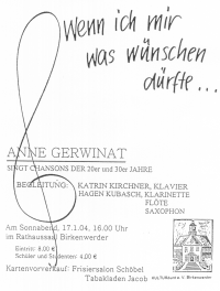 Ein Konzert für Orgel und Gesang findet am 16.11.03 um 17.00 Uhr in der ev. Kirche Birkenwerder statt.